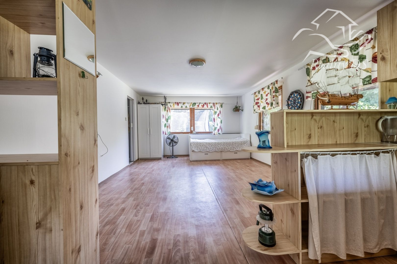 Nachádza sa tu posteľ, kuchynský kút a stále je dostatok priestoru aj pre rozkladací gauč alebo viac lôžok.