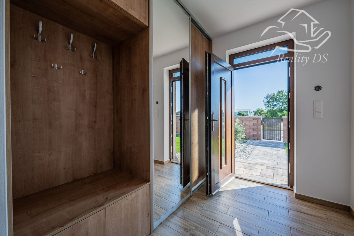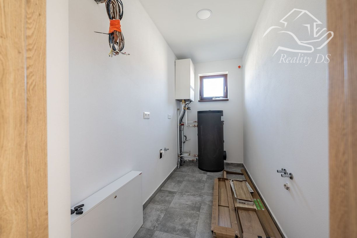 V technickej miestnosti je príprava pre sušičku, automatickú pračku, rozdeľovač podlahového kúrenia, tepelné čerpadlo so zásobníkom vody.