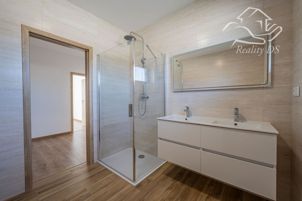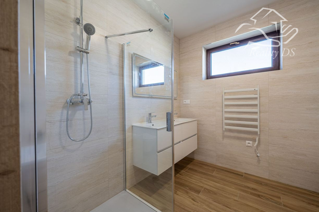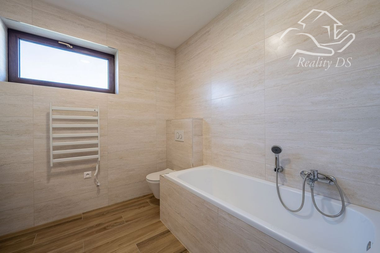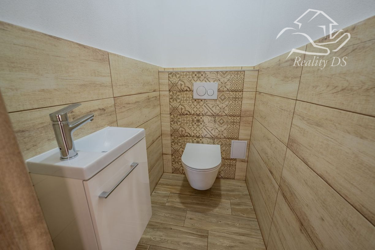 Kúpeľňa so sprchovacím kútom, klasickou vaňou, WC+bidet (2 v 1), ďalej kúpeľňový nábytok s dvojumyvadlom, zrkadlom, batérie. Samostatné WC pre hostí s WC+bidet (2 v 1) a s umyvadlom so skrinkou.