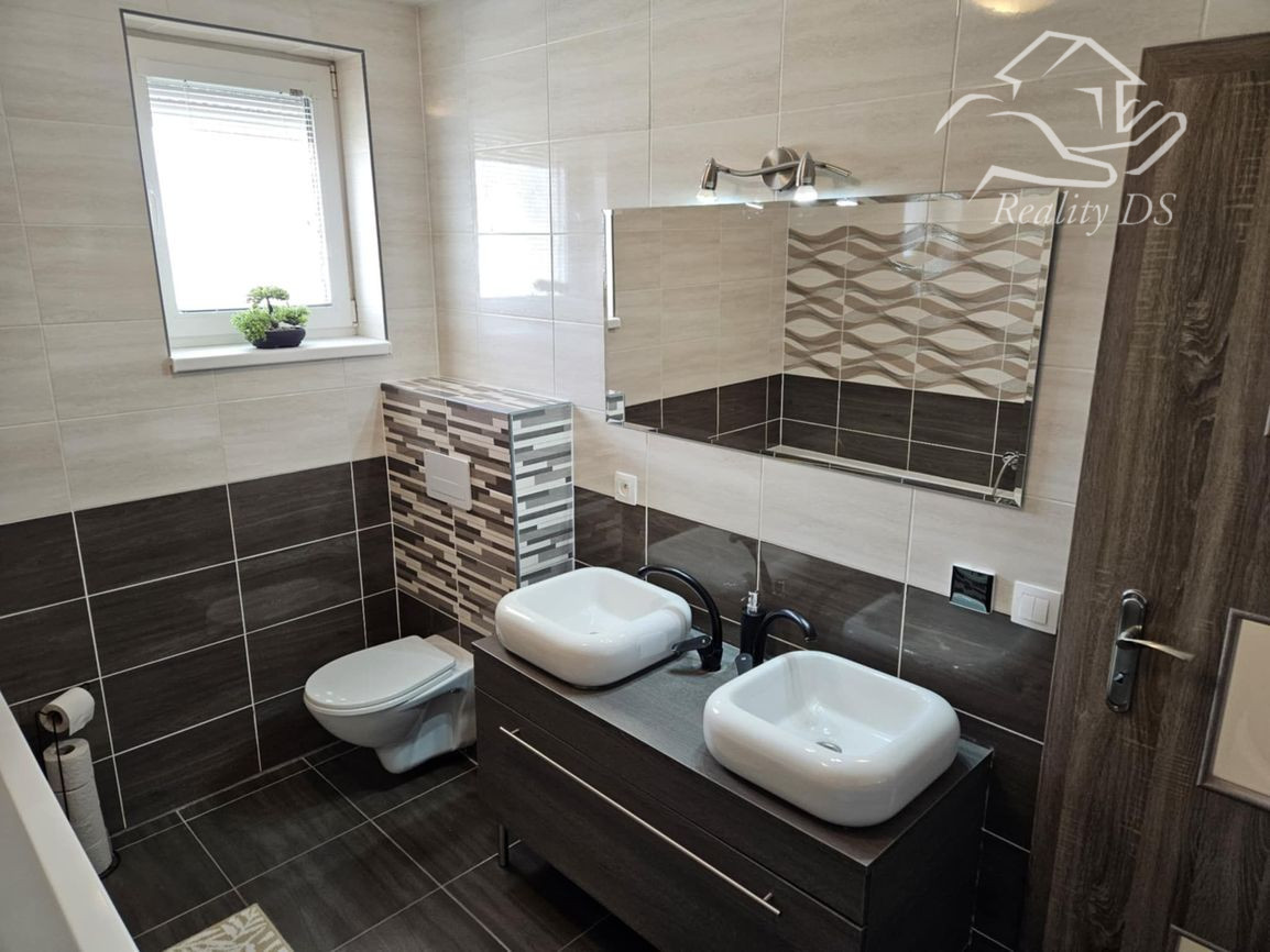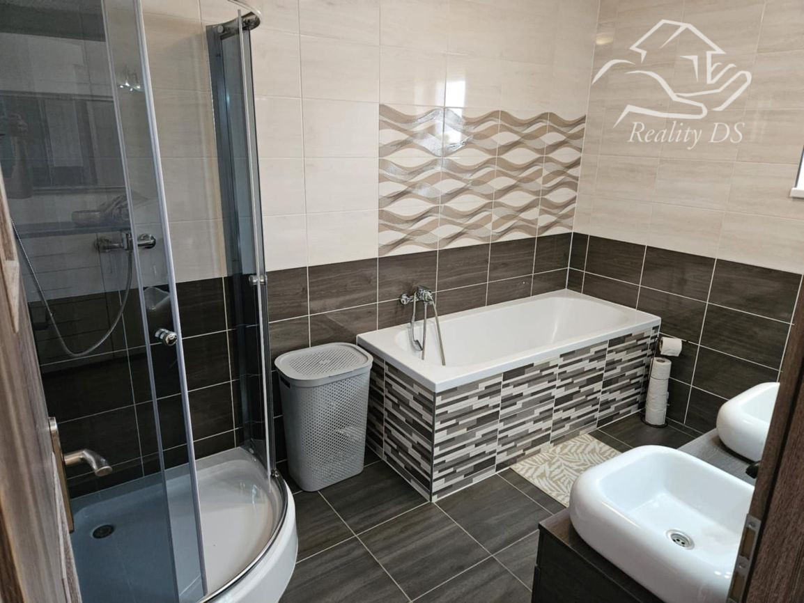 VYBAVENIE interiéru: kvalitné interiérové dvere so zárubňami v celom dome, celoplošné plávajúce parkety, dlažba, obklad v kúpeľni, kúpeľňa vybavená sprchovacím kútom, WC v kúpeľni, aj samostatné pre hostí, klasická vaňa, 2 x umývadlo so skrinkou. Príprava pre alarm, v každej miestnosti termostat. Kuchyňa je vybavená kuchynskou linkou na mieru, so zabudovanými spotrebičmi (digestor, elektrická varná doska, elektrická rúra, miesto pre zabudovanú chladničku s mrazničkou (chladnička je ale mimo linky)