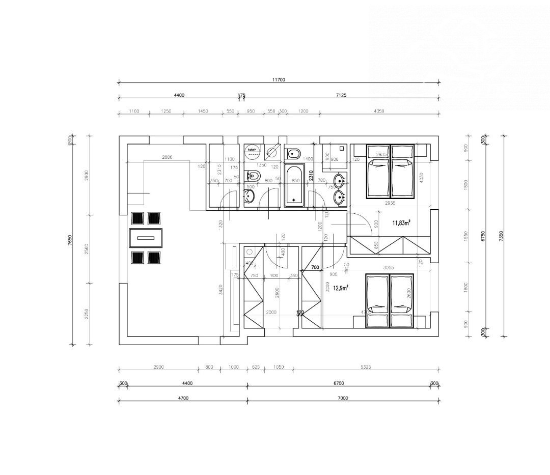 Nočná časť: dve samostatné izby, technická miestnosť s toaletou pre hostí a kúpeľňa s toaletou, sprchou, vaňou a umyvadlom.