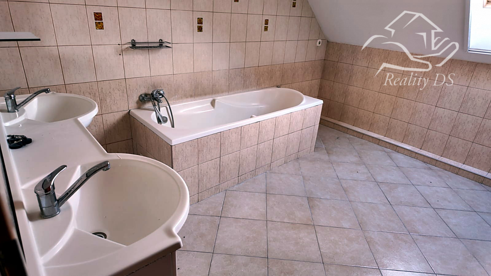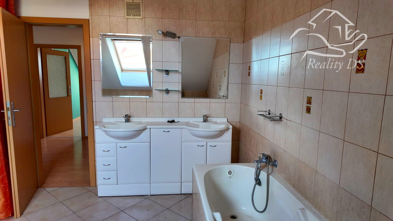 Na vrchnom podlaží je priestranná kúpeľňa s vaňou, umývadlom so skrinkou, zrkadlom a rebríkovým radiátorom. V rámci kúpeľne sa nachádza schodisko vedúce na povalu, ktoré poskytuje prístup do podkrovného úložného priestoru. WC je samostatné a prístupné z chodby