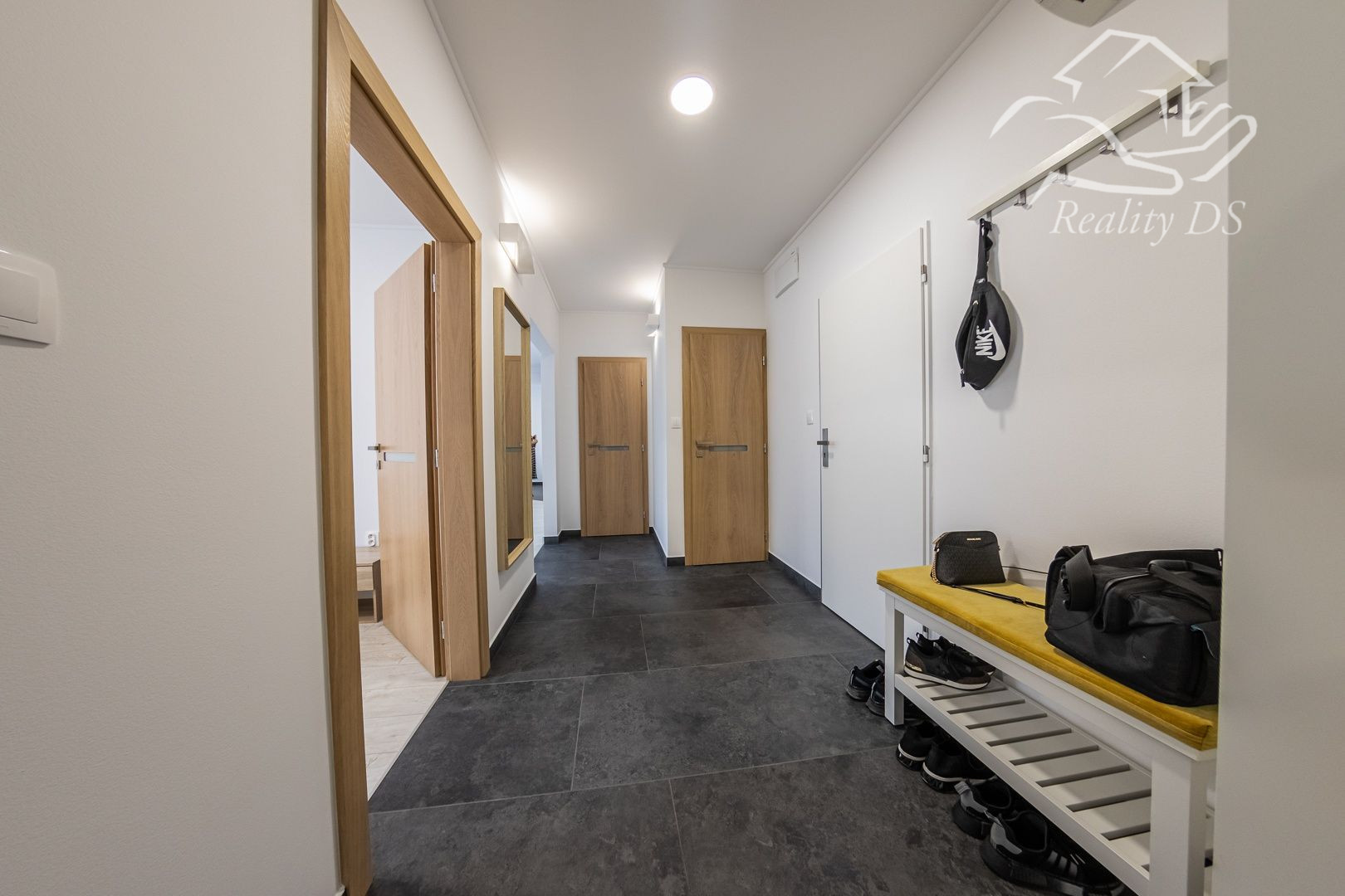 Byt pozostáva zo vstupnej chodby, dvoch samostatných izieb, kuchyne spojenej s obývačkou, špajze, samostatného WC a kúpeľne s vaňou. Byt má možnosť využívania spoločnej chodby so susedným bytom (8m², z toho 4m² možné využívať). Spoločná chodba je uzamykateľná a monitorovaná kamerovým systémom.