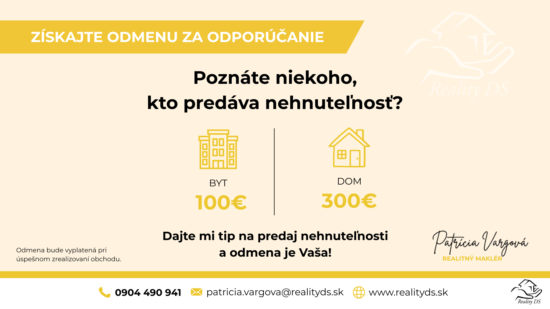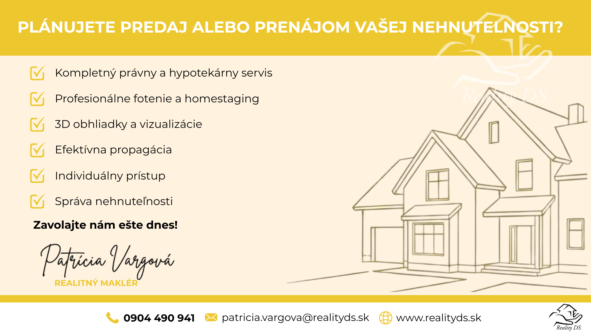 Bližšie informácie a dohodnutie termínu obhliadky získate na telefónnom čísle: 0904 490 941 – Patrícia Vargová (Majorošová)