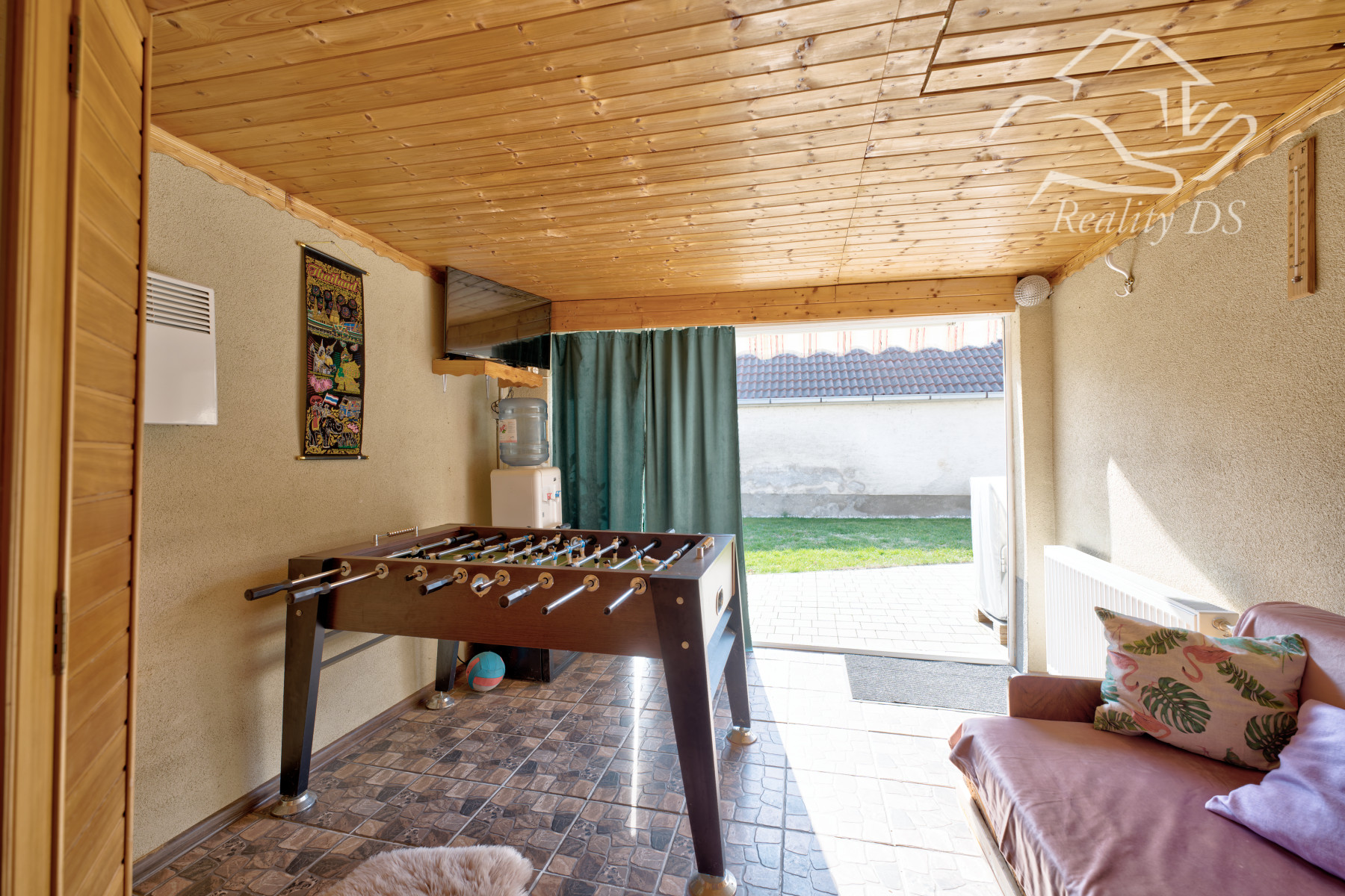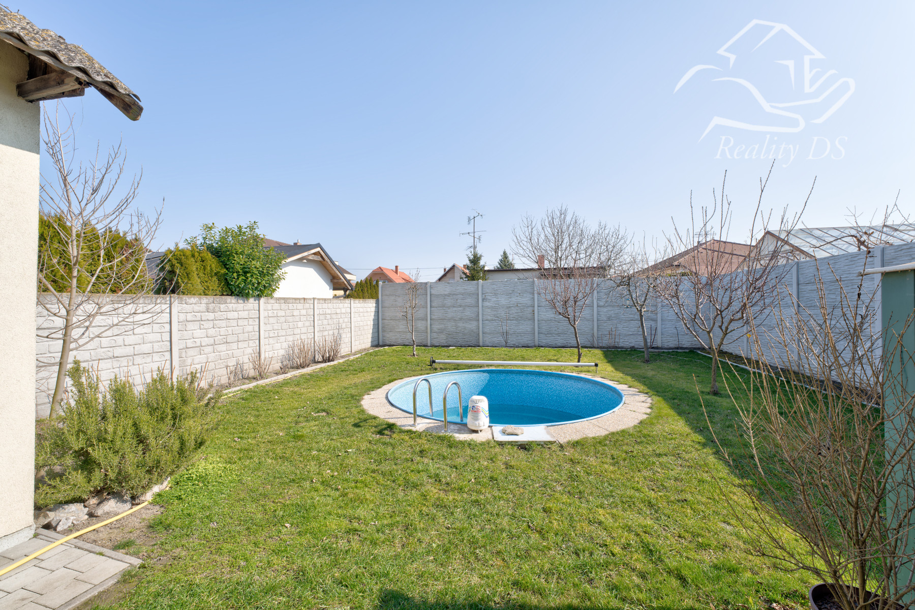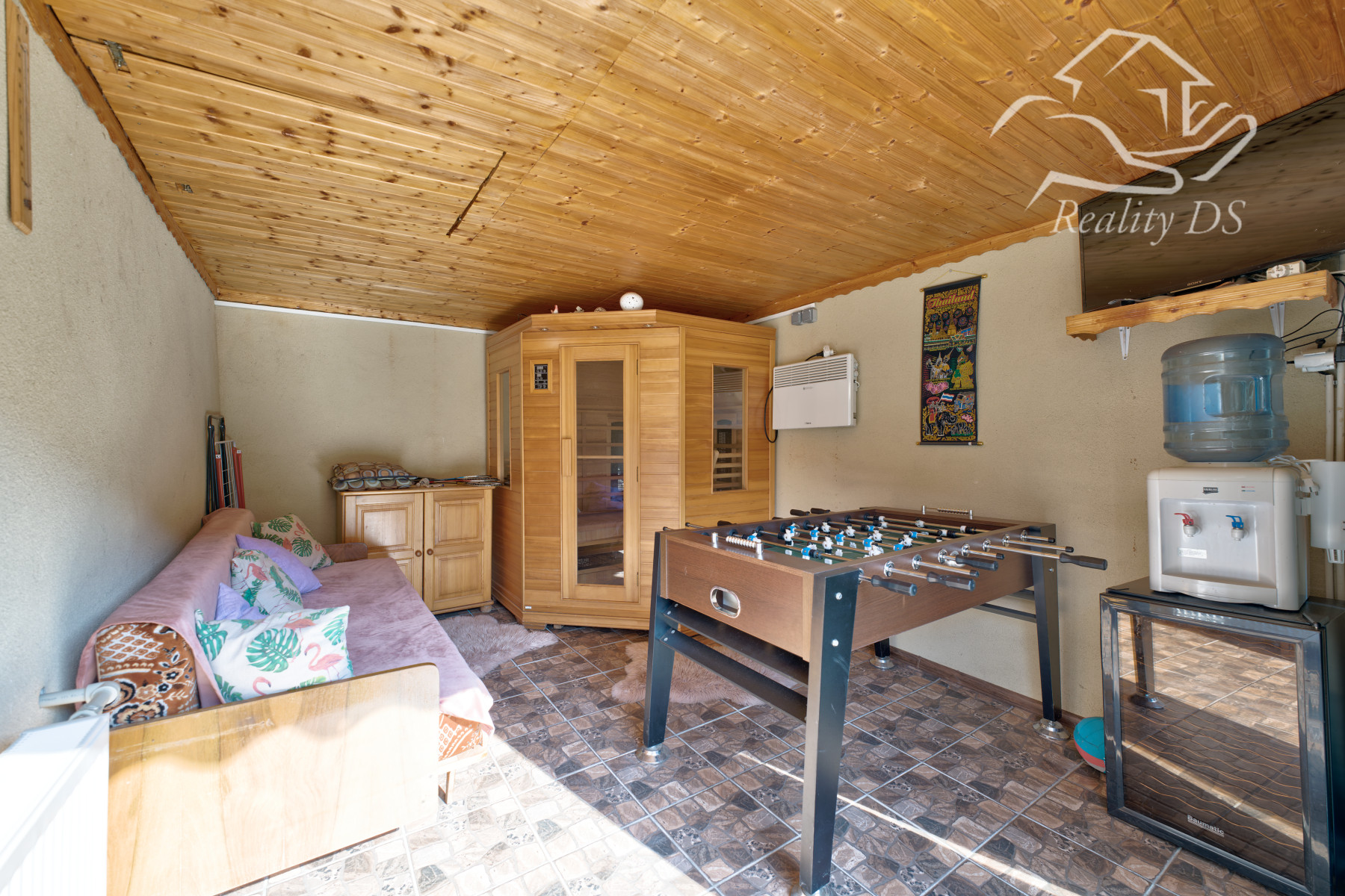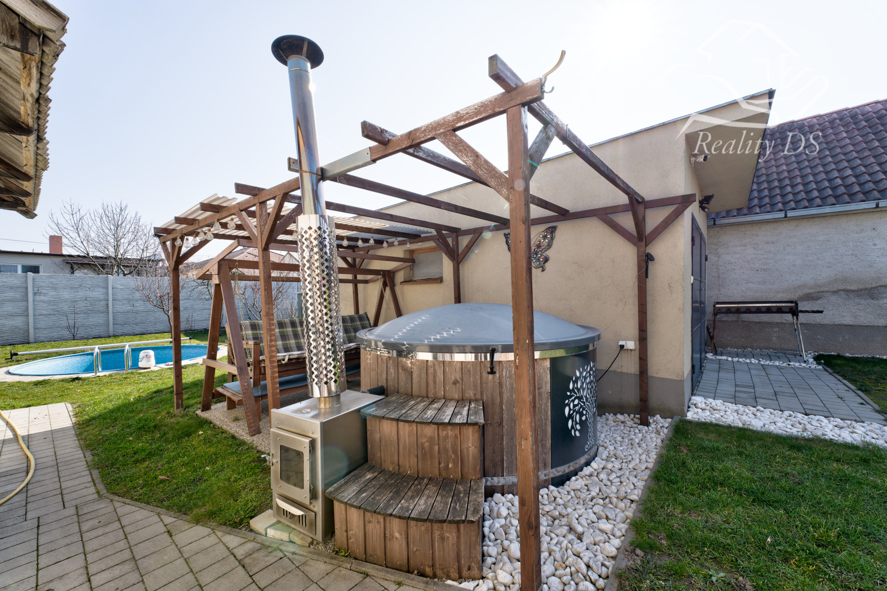 Pozemok o výmere 650 m² je využitý do posledného detailu a poskytuje nadštandardné zázemie pre relax na úrovni súkromného wellnessu. Parkovanie je zabezpečené pre 3 autá priamo na pozemku. K dispozícii je aj samostatná garáž (25 m²) so súpisným číslom. Vstup na pozemok je riešený elektrickou bránou na diaľkové ovládanie. Oddychová zóna ponúka zapustený bazén s vyhrievaním a protiprúdom, herňu so saunou, soľnú relaxačnú miestnosť a exteriérovú kúpaciu kaďu s vykurovaním na drevo. Na pozemku sa ďalej nachádza letná kuchynka, priestranná terasa s posedením, záhradný domček, drevená záhradná hojdačka a úrodné ovocné stromy.
