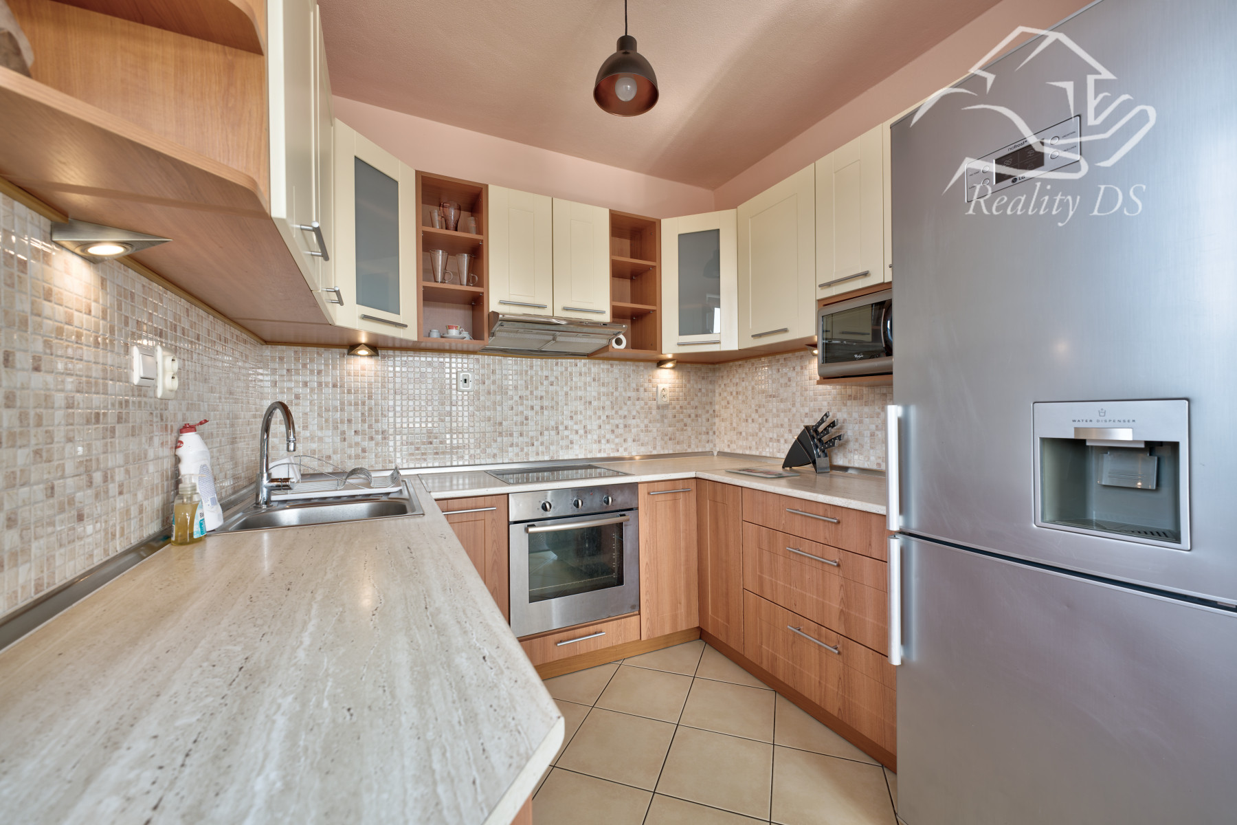 - kuchynská linka so zabudovanými spotrebičmi ( el. rúra, mikrovlnná rúra, el. varná doska, umývačka riadu, digestor, chladnička s mrazničkou),