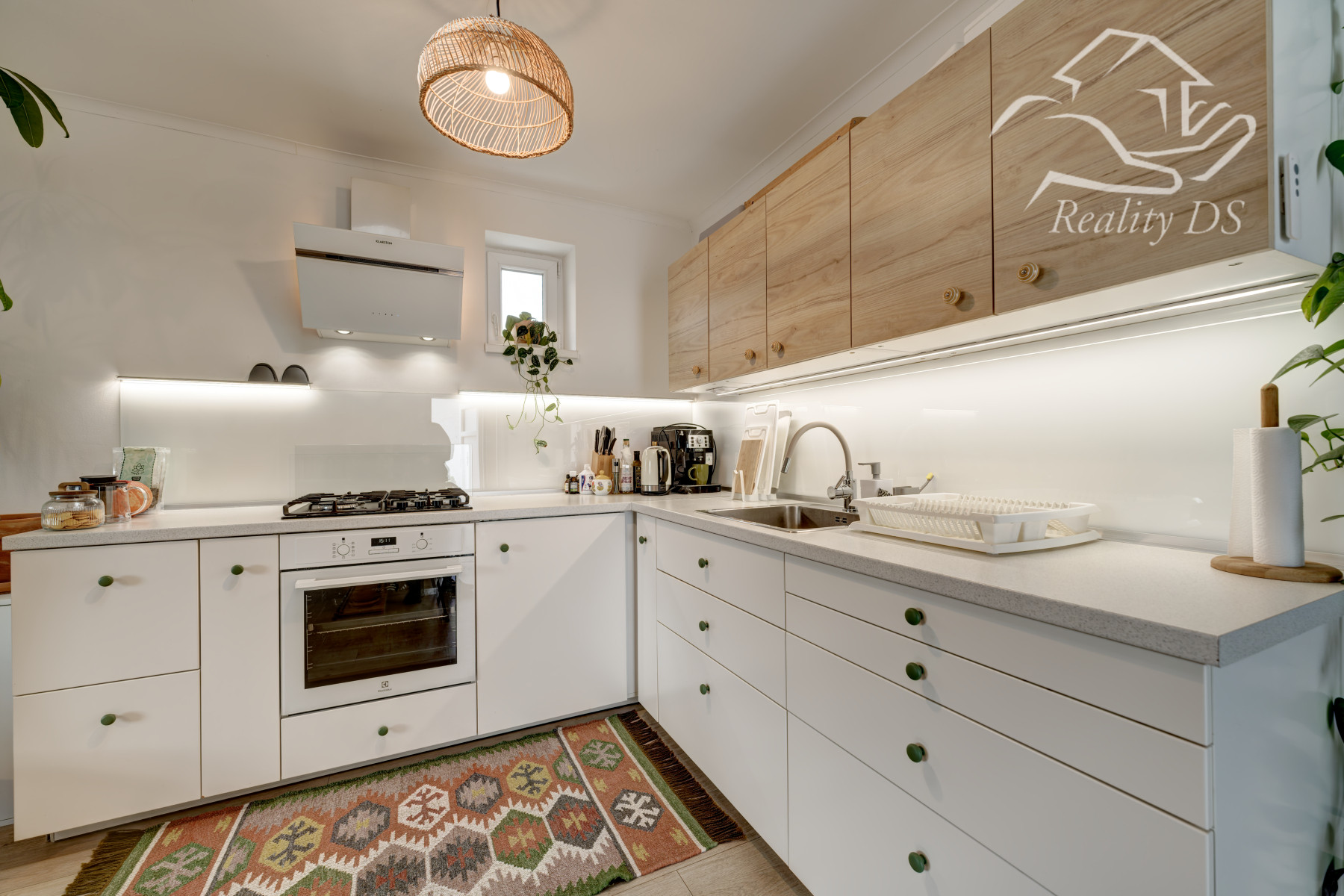 moderná nová kuchynská linka, do tvaru L, so zabudovanými spotrebičmi (odsávač vzduchu, plynová varná doska, elektrická rúra, chladnička s mrazničkou),